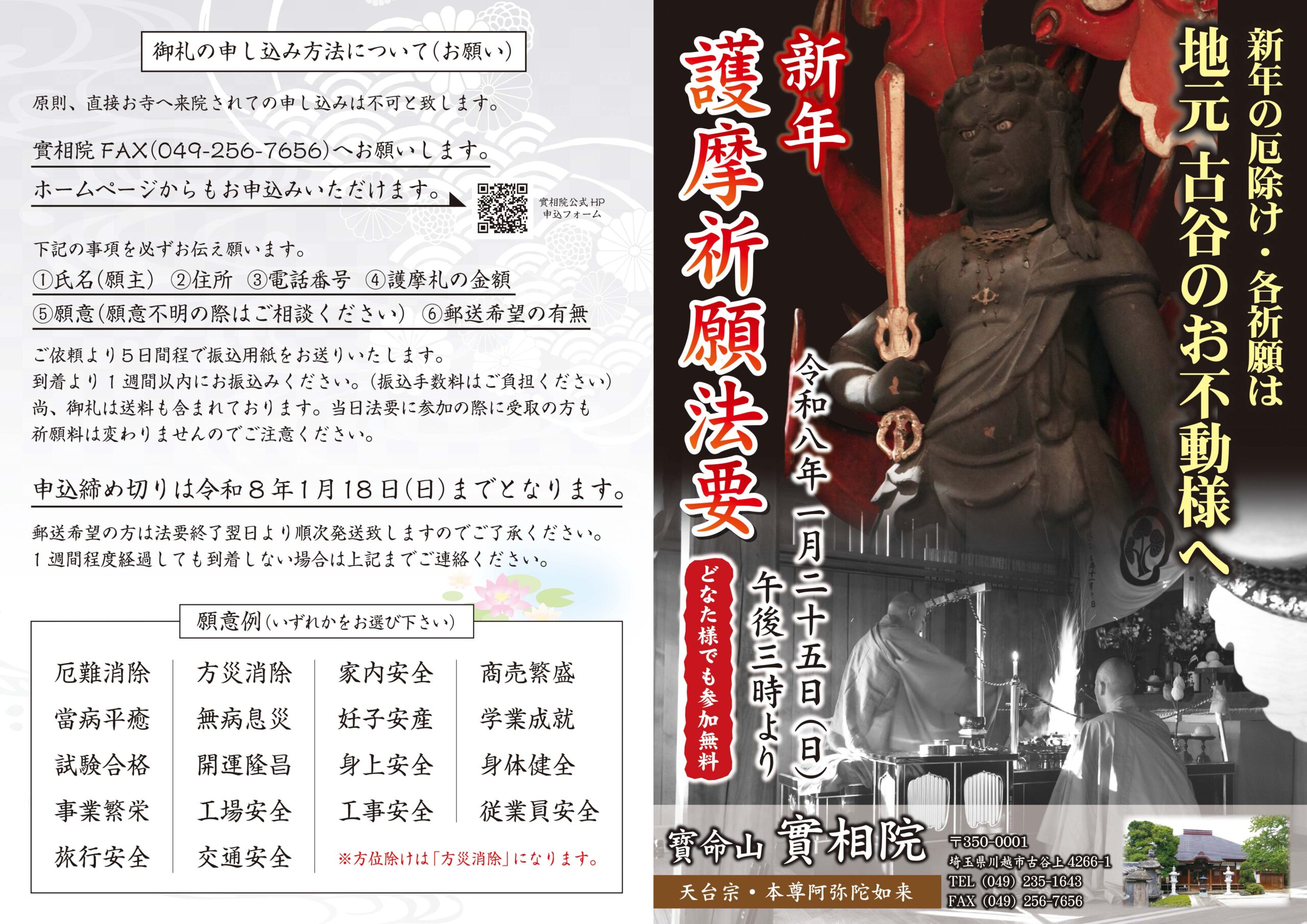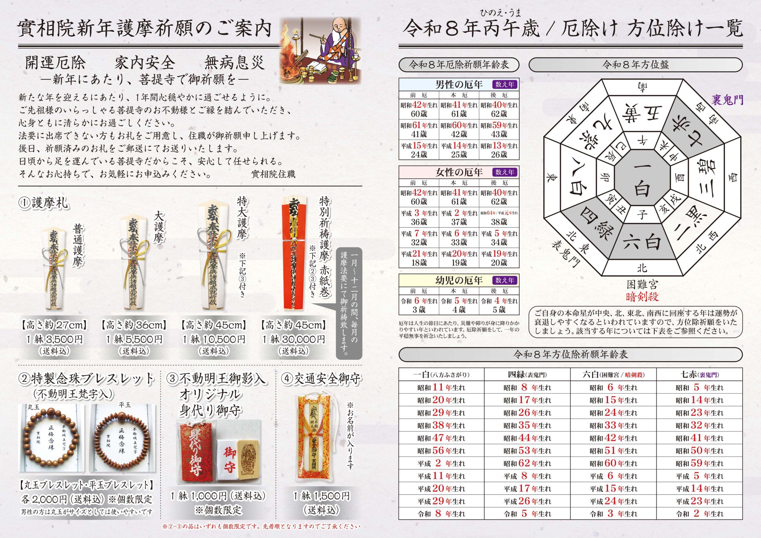 また、祈願内容により妙見菩薩護摩(厄除け・開運等)や弁財天護摩(商売繁盛・金運向上・習い事成就等)も承りますので、お気軽にお問合せください。