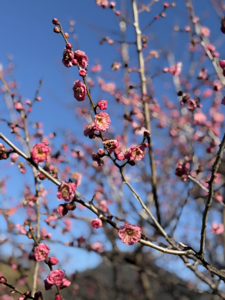 暖かな日差しの中で、紅白の梅の花が開花しているのを